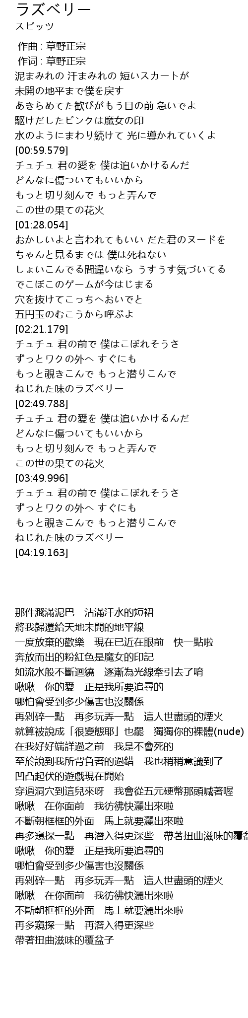 | [02:36.635] | もっと覗きこんで もっと潜りこんで ねじれた味のラズベリー |