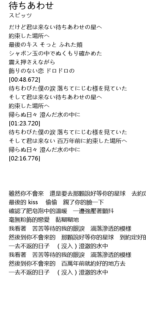 | [00:18.874] | だけど君は来ない待ちあわせの星へ 約束した場所へ |