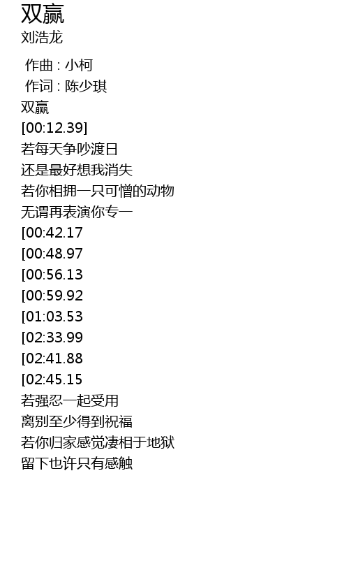 | [03:02.77][02:33.99][01:09.55] | 别要一起输 无能力抱住 心切痛还做梦 |