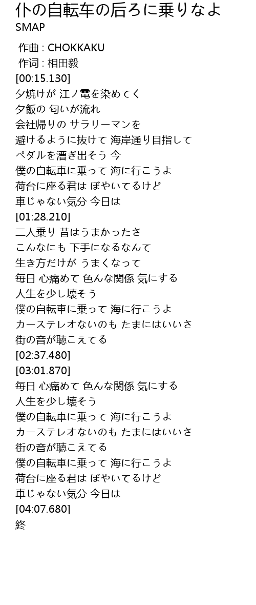 | [01:07.530] | 僕の自転車に乗って 海に行こうよ |