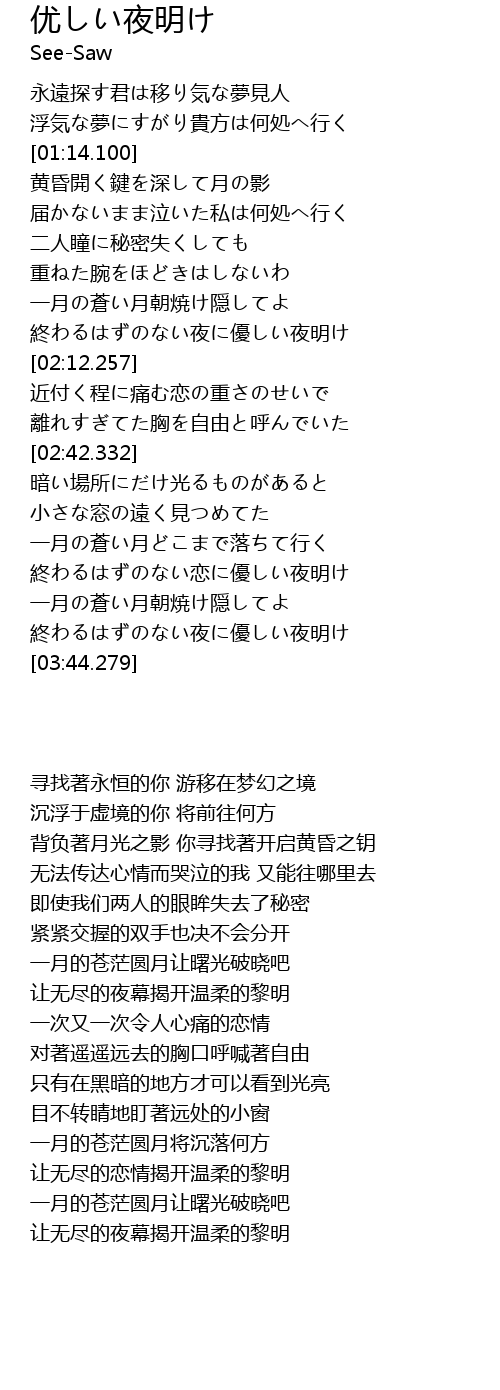 | [02:01.040] | 終わるはずのない夜に優しい夜明け |