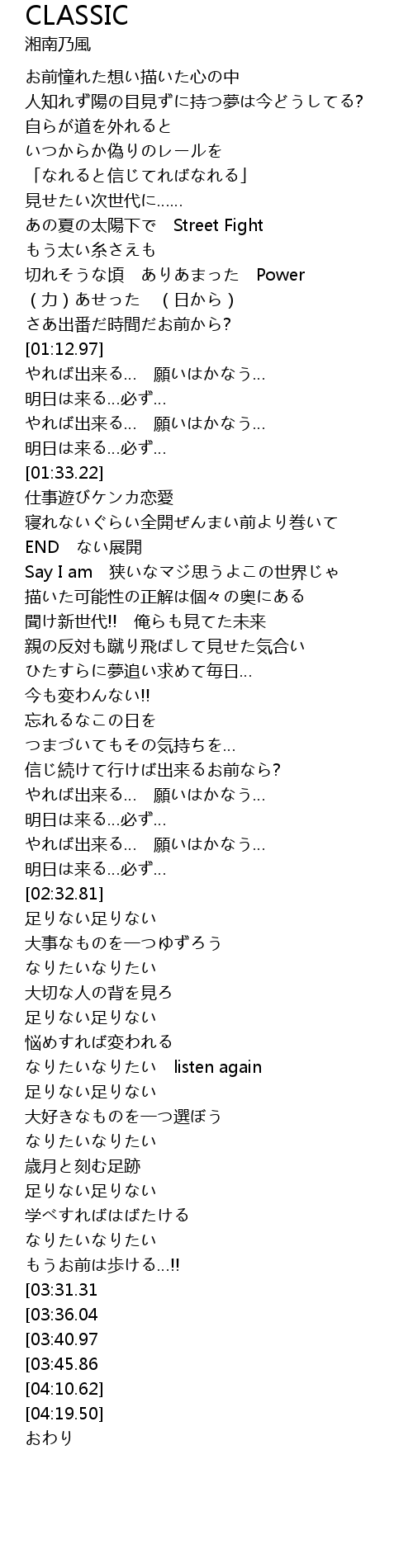 | [01:53.40] | 聞け新世代!! 俺らも見てた未来 |