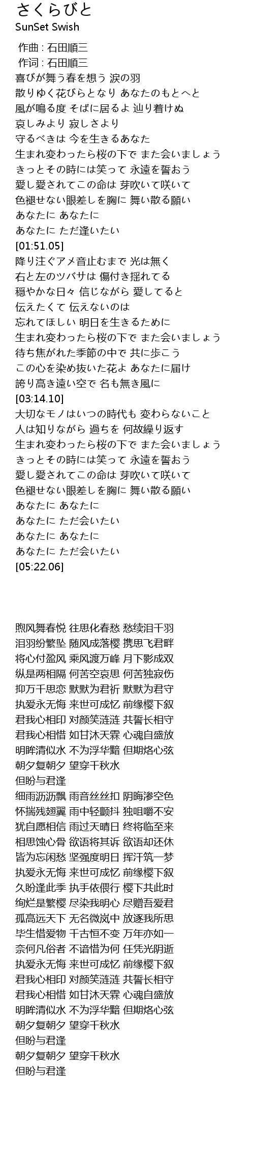 | [01:14.54] | 生まれ変わったら桜の下で また会いましょう |