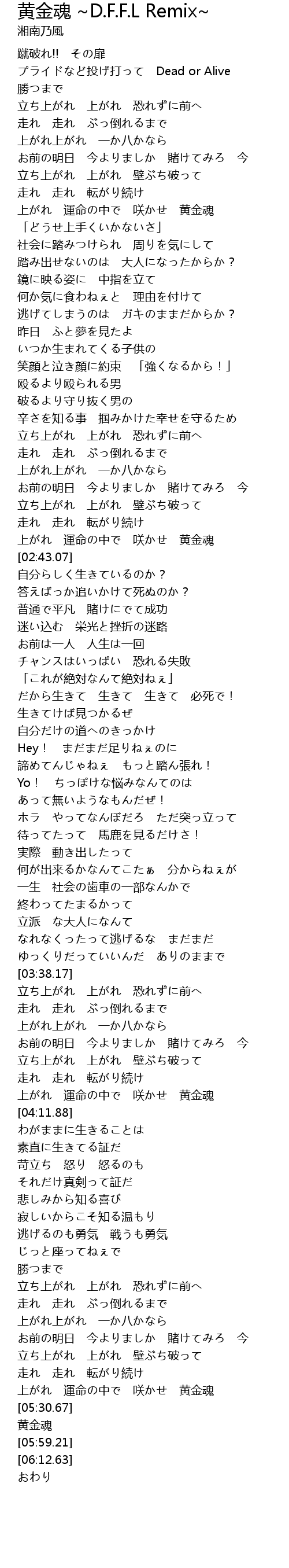 | [04:01.49] | 上がれ 運命の中で 咲かせ 黄金魂 |