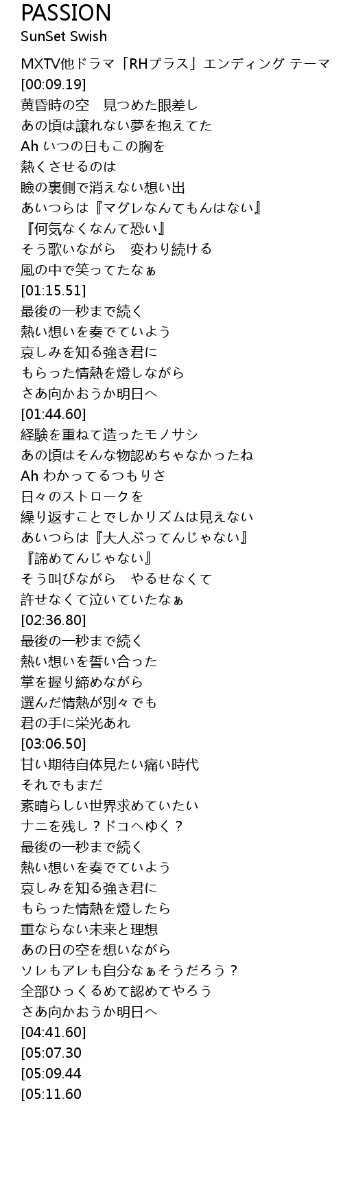 | [05:20.35][05:09.44][04:58.58][04:47.64] | Passion Days |