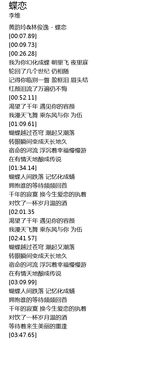 | [00:01.12] | 黄韵玲&林俊逸 - 蝶恋 |