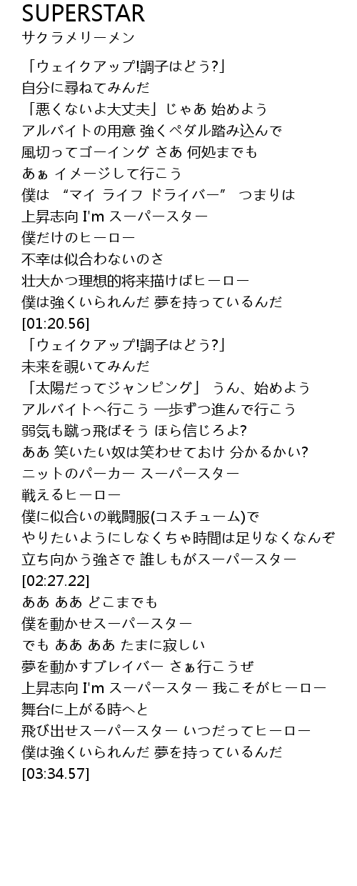 | [00:55.51] | 上昇志向 I'm スーパースター |