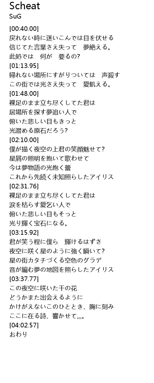 | [03:54.64] | ここに在る詩、響かせて,,,。 |