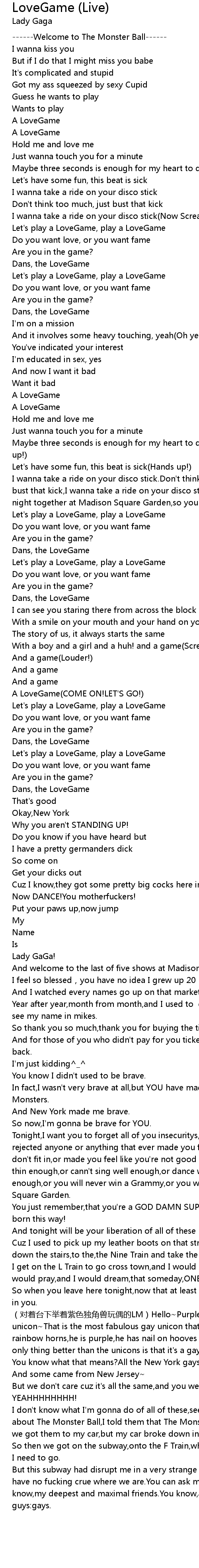 | [07:34.000] | Tonight, I want you to forget all of you insecuritys, I want you to rejected anyone or anything that ever made you feel like you don' t belong, or don' t fit in, or made you feel like you' re not good enough, for pretty enough, or thin enough, or cann' t sing well enough, or dance well enough, or write a song not enough, or you will never win a Grammy, or you will never sing up at Madison Square Garden. |