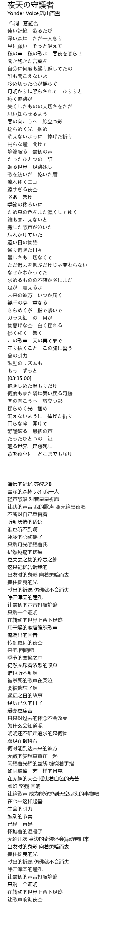 | [00:29.70] | 私の声 私の歌よ 闇夜を照らせ |