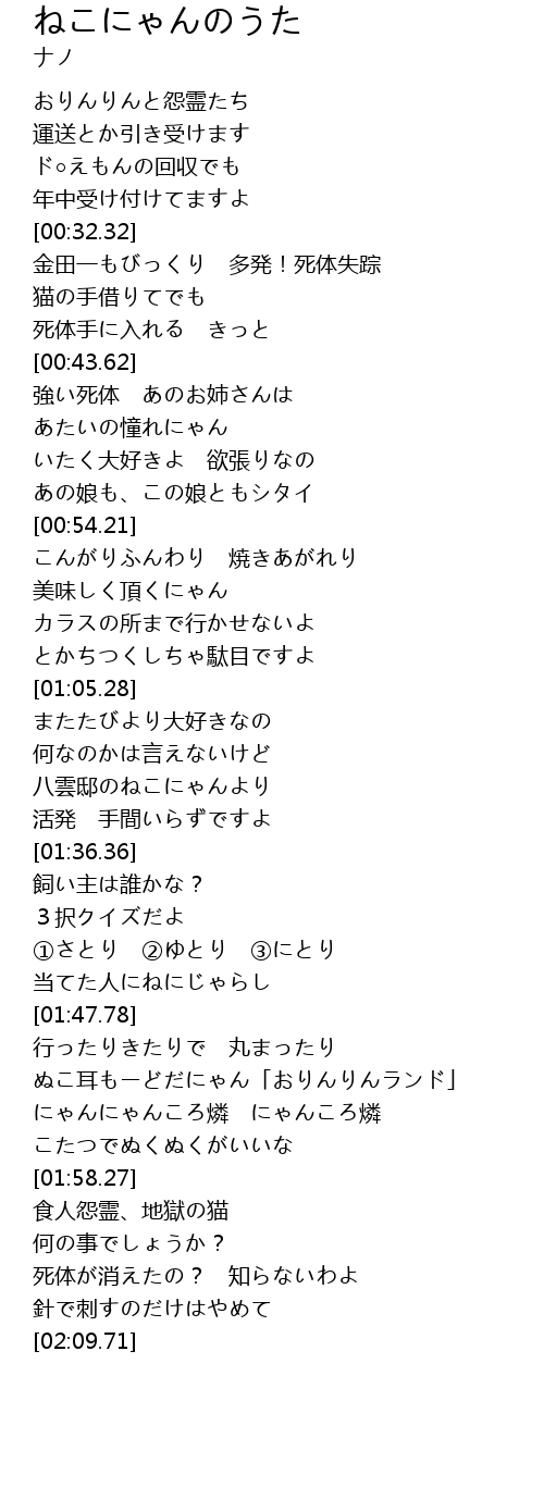 | [01:50.81] | ぬこ耳もーどだにゃん「おりんりんランド」 |