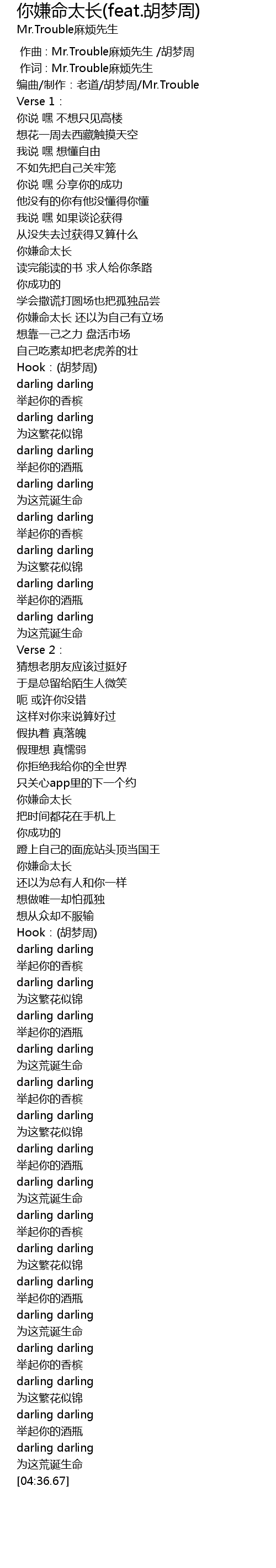 | Song | 你嫌命太长(feat.胡梦周) |