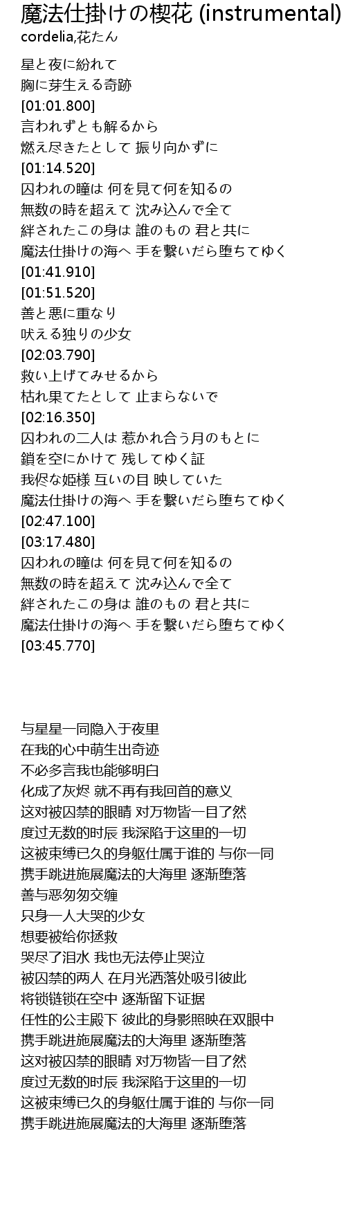 | [03:37.180] | 魔法仕掛けの海へ 手を繋いだら堕ちてゆく |
