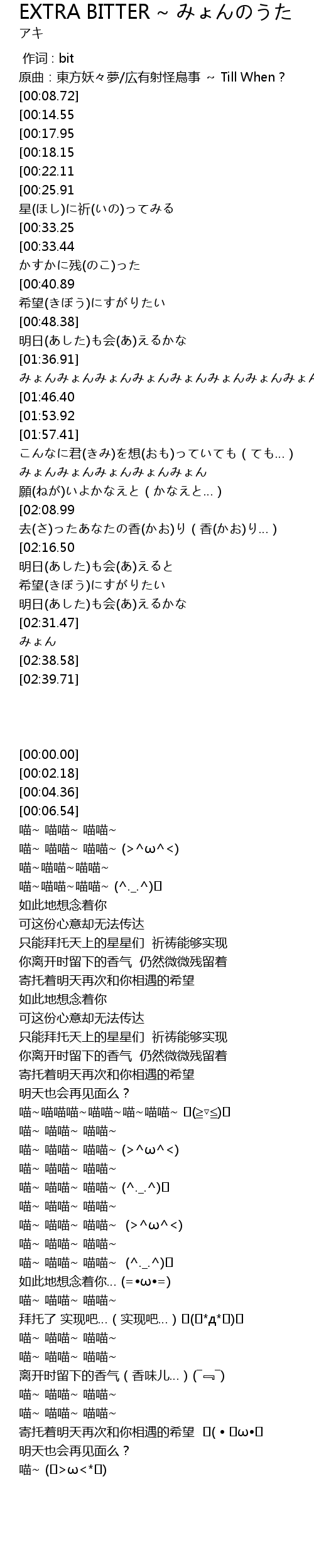 | [01:55.79][01:53.92][01:52.09][01:50.25] | みょんみょんみょんみょんみょん |
