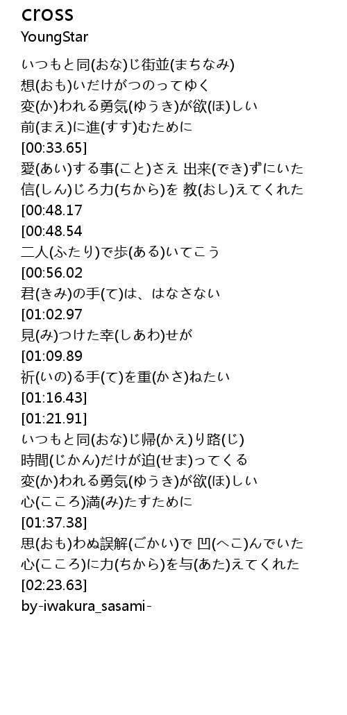 | [02:03.03][00:56.02] | 季節(きせつ)に迷(まよ)う時(とき)がきても 君(きみ)の手(て)は、はなさない |