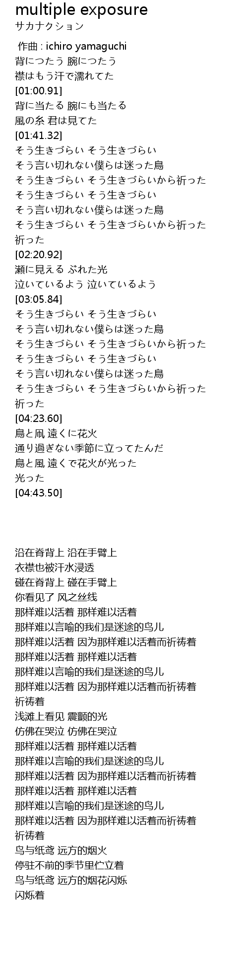 | [04:33.86] | 鳥と風 遠くで花火が光った |