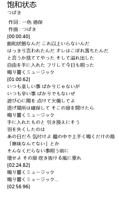 | [00:14.94] | 飽和状態なんだ これ以上いらないんだ |