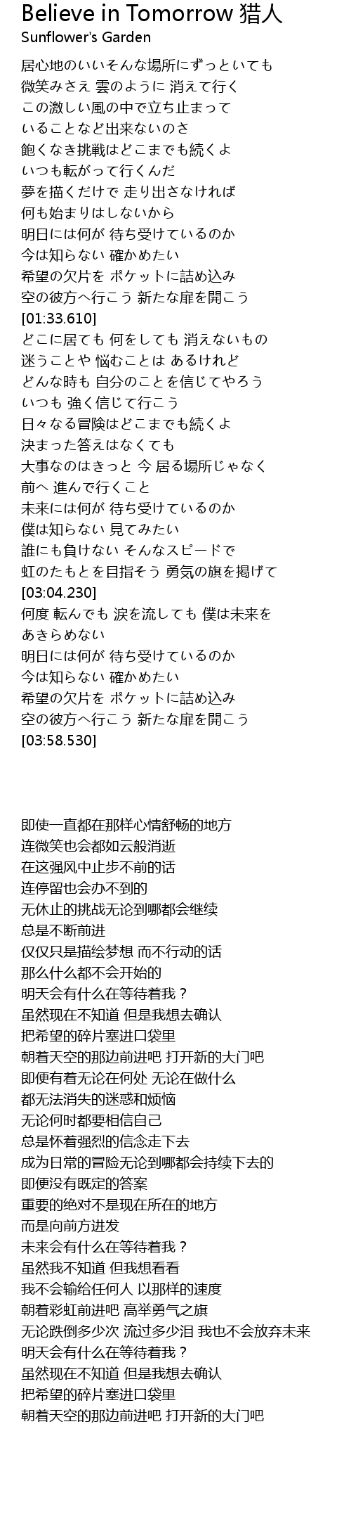 | Song | Believe in Tomorrow 猎人 |