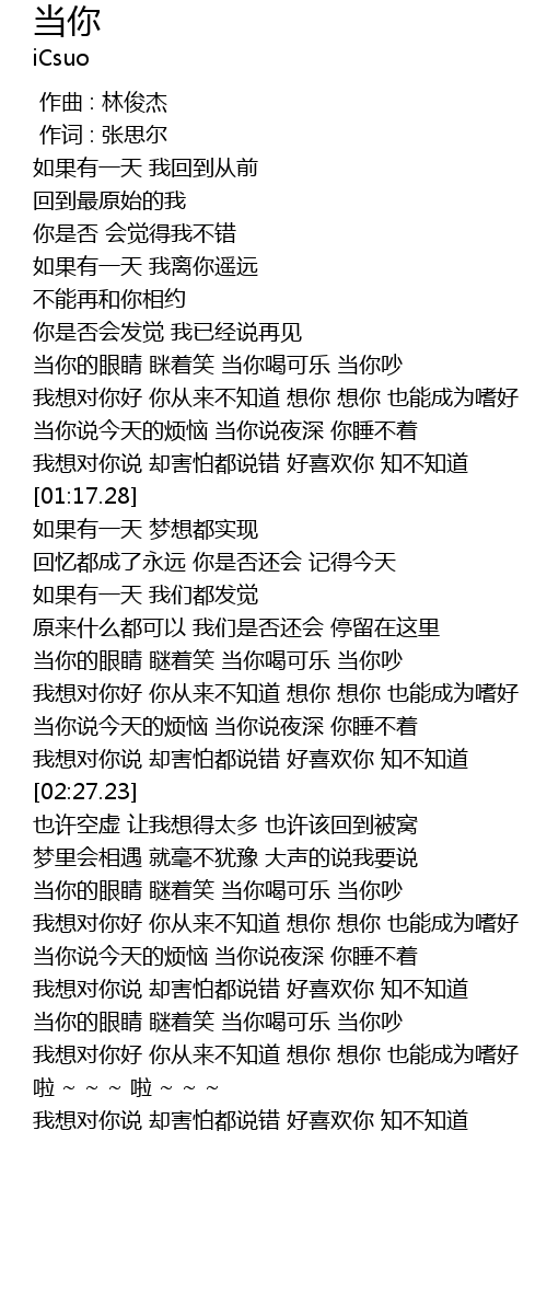 | [01:55.16] | 当你的眼睛 瞇着笑 当你喝可乐 当你吵 |