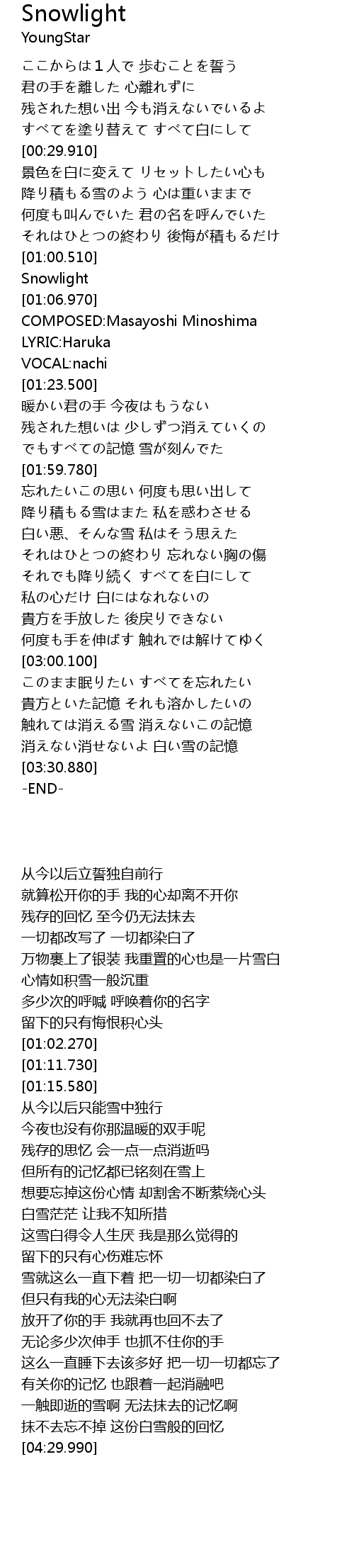 | [03:22.590] | 消えない消せないよ 白い雪の記憶 |