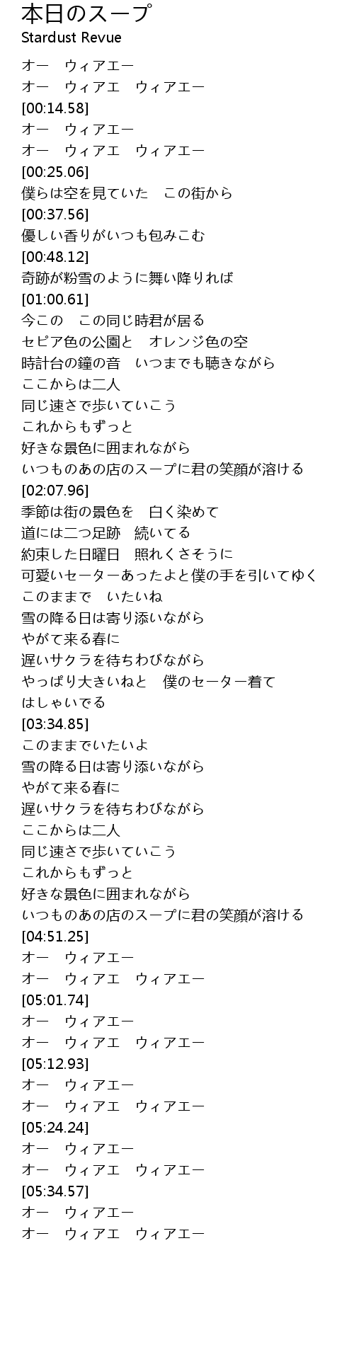 | [04:38.19] | いつものあの店のスープに君の笑顔が溶ける |
