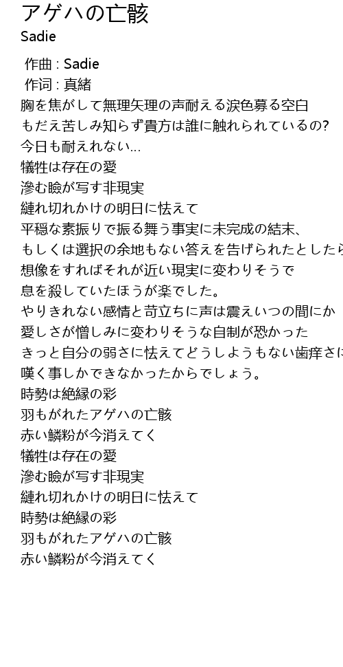 | [03:56.61] | 羽もがれたアゲハの亡骸 |