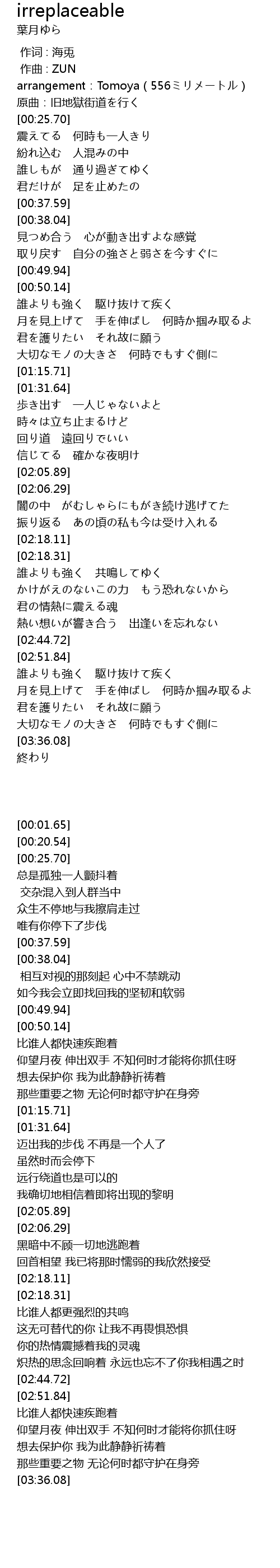| [00:50.29] | 誰よりも強く 駆け抜けて疾く |