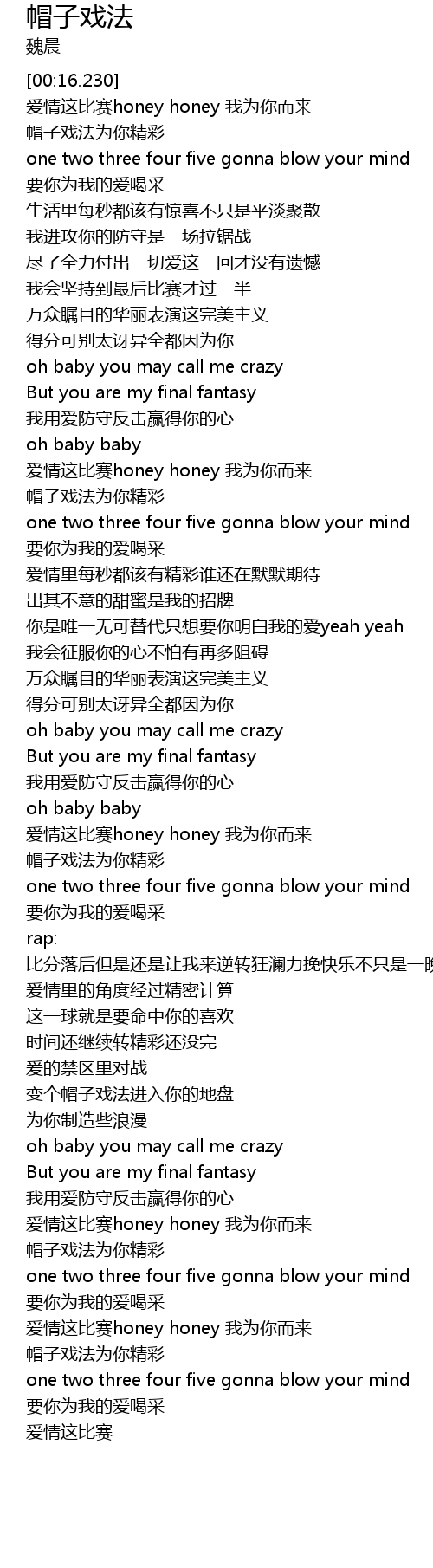 | [01:23.542] | mào zi xì fǎ wèi nǐ jīng cǎi |