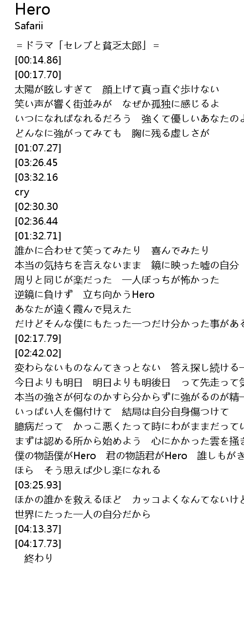 | [01:56.53] | 逆鏡に負けず 立ち向かうHero あなたが遠く霞んで見えた |