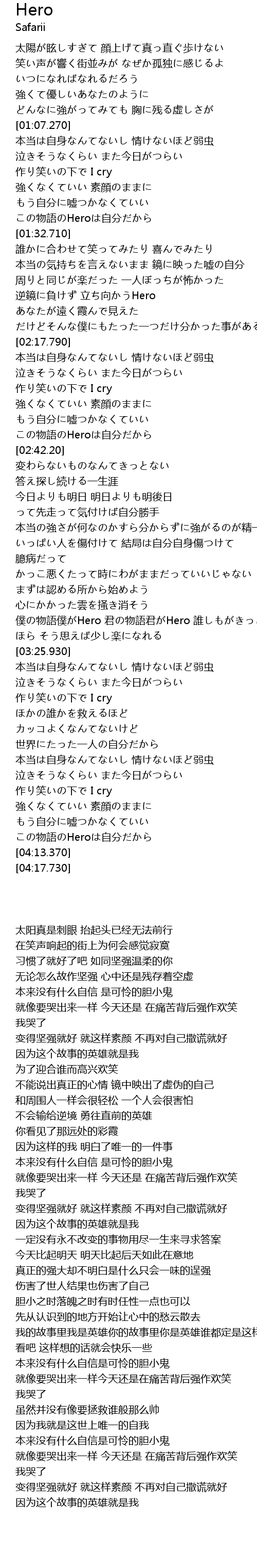| [03:15.800] | 僕の物語僕がHero 君の物語君がHero 誰しもがきっと |