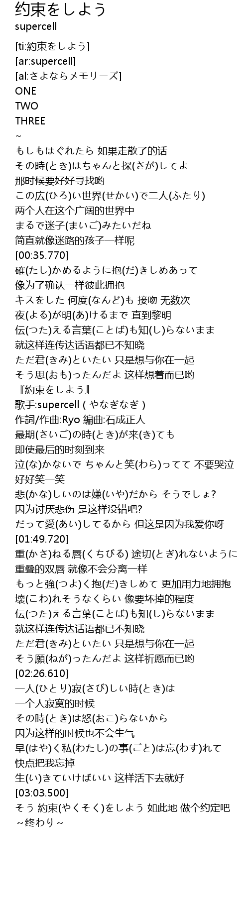 | [03:08.940] | そう 約束(やくそく)をしよう 如此地 做个约定吧 |