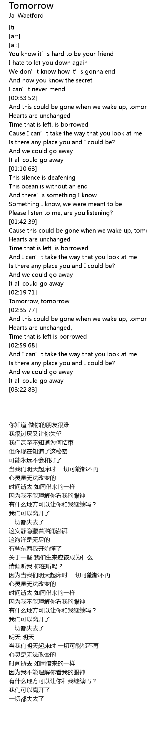 | [00:33.77] | And this could be gone when we wake up, tomorrow |