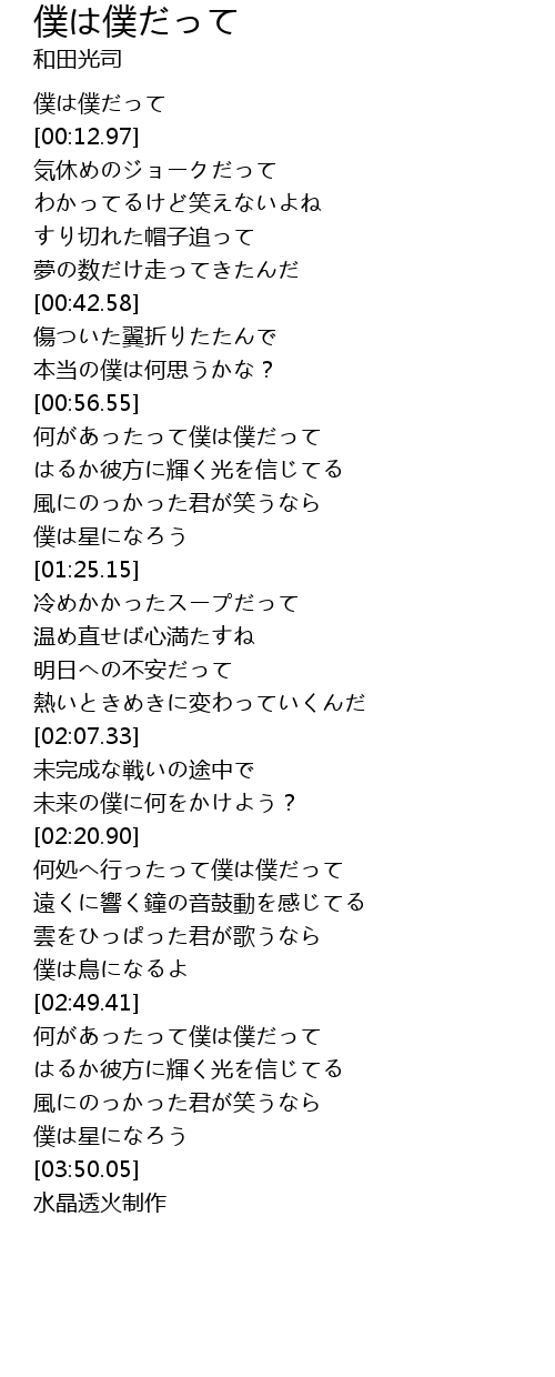 | [03:21.68] | 何があったって僕は僕だって |