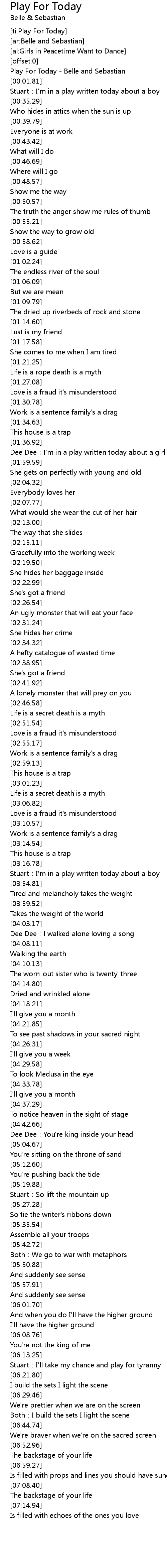 | [00:00.47] | Play For Today - Belle and Sebastian |