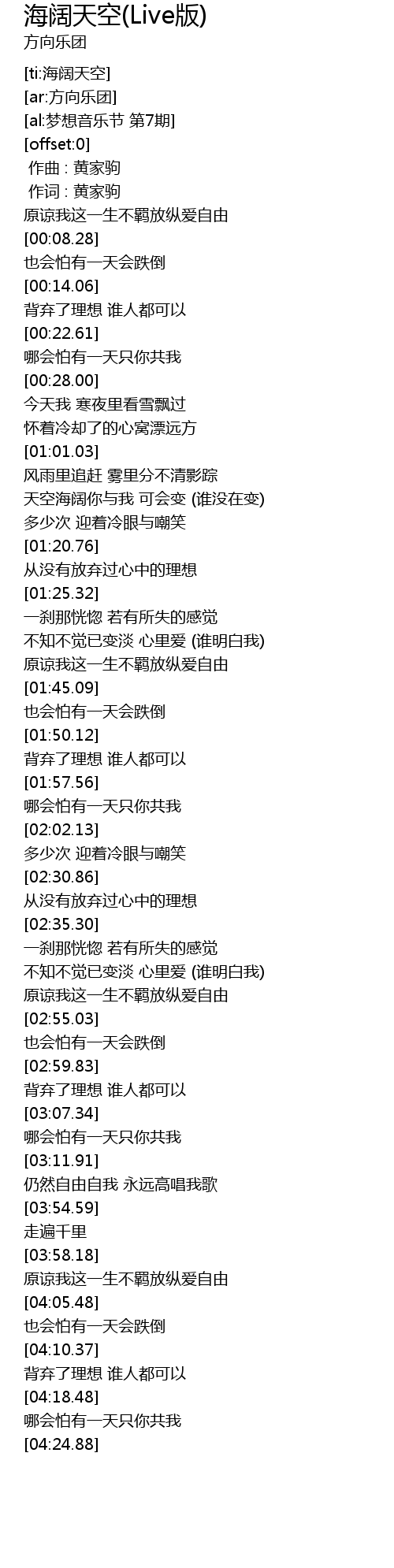 | [01:08.80] | tiān kōng hǎi kuò nǐ yǔ wǒ kě huì biàn shuí méi zài biàn |