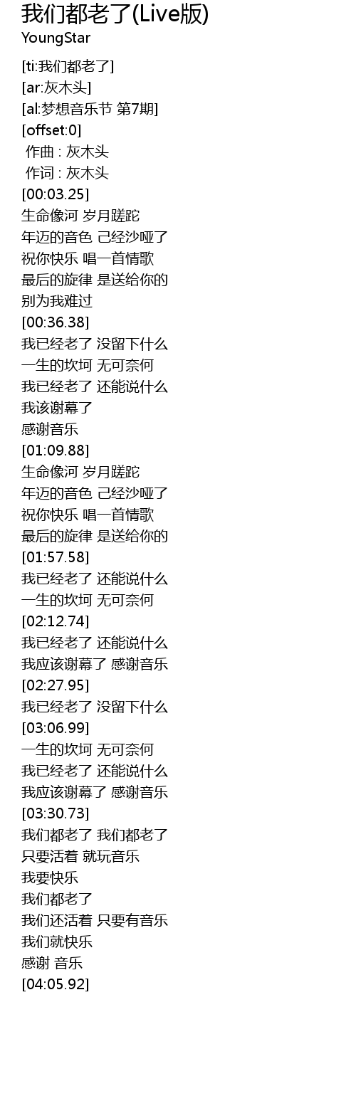 | [03:37.49] | wǒ men dōu lǎo le wǒ men dōu lǎo le |