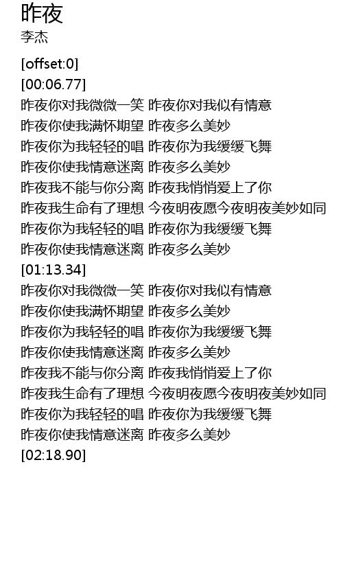 | [01:26.15] | 昨夜你对我微微一笑 昨夜你对我似有情意 |