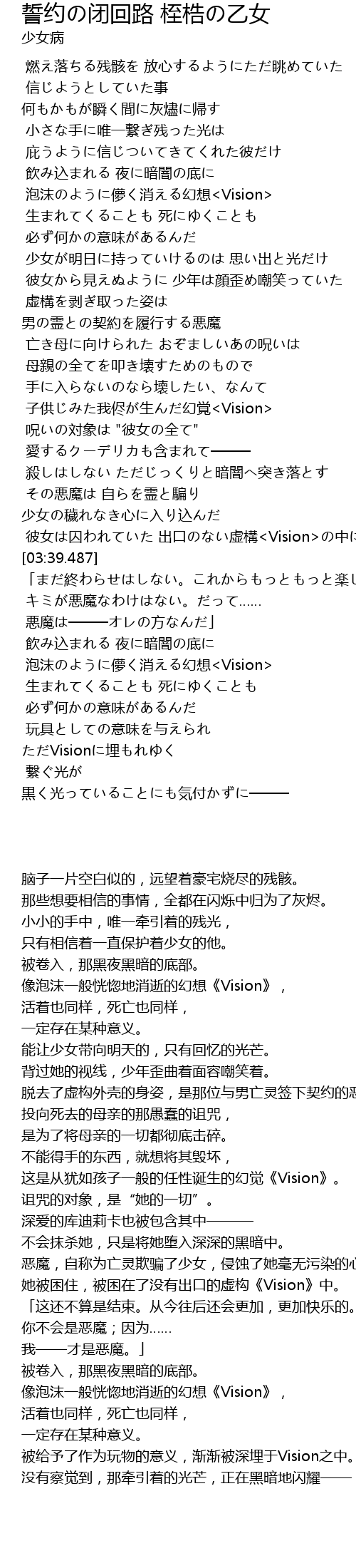 | [02:40.283] | 子供じみた我侭が生んだ幻覚<Vision> |
