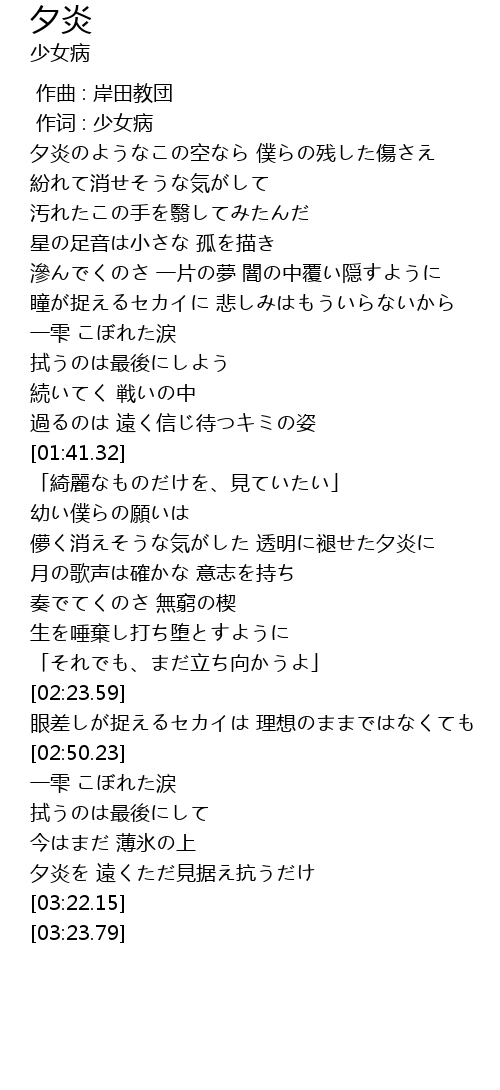 | [03:12.30] | 夕炎を 遠くただ見据え抗うだけ |