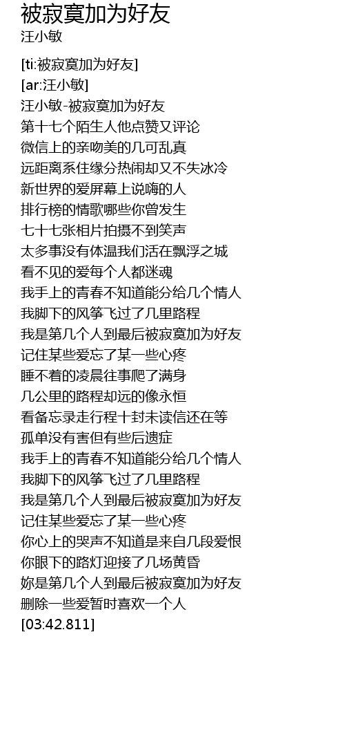 | [00:00.826] | 汪小敏-被寂寞加为好友 |