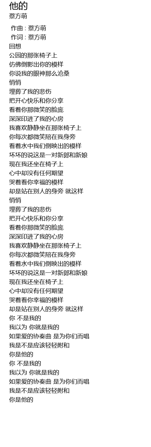 | [00:01.00] | 作词 : 蔡方萌 |
