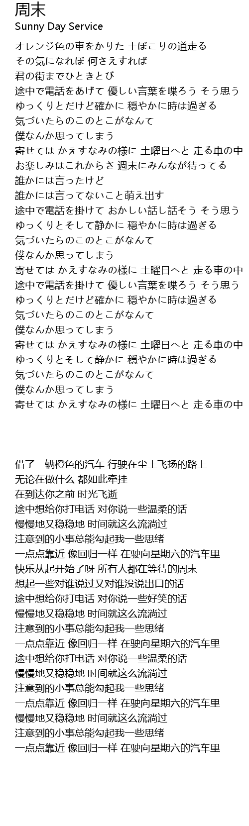 | [02:52.18] | 寄せては かえすなみの様に 土曜日へと 走る車の中 |