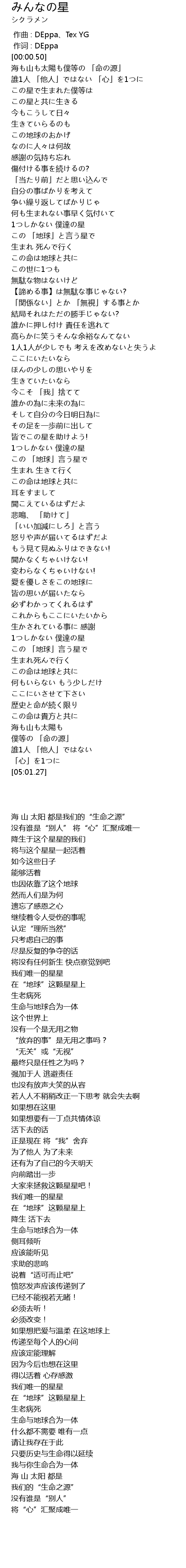 | [00:22.43] | 海も山も太陽も僕等の 「命の源」 |