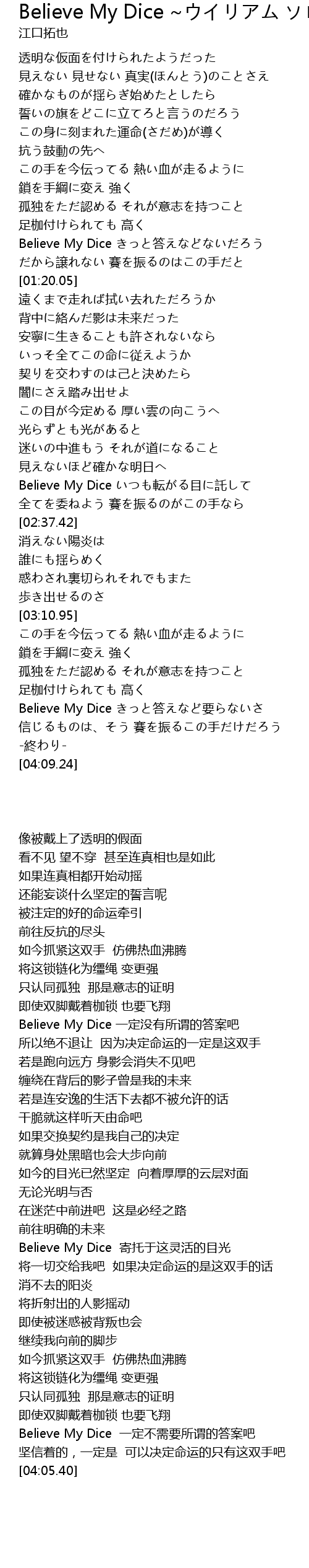 | [03:41.92] | Believe My Dice きっと答えなど要らないさ |
