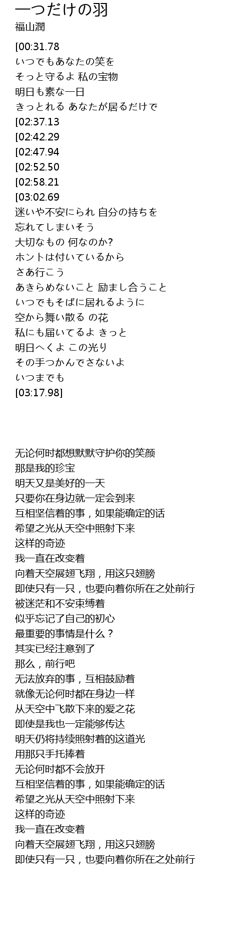 | [00:52.33][02:58.21] | 空へと羽ばたく この羽で |