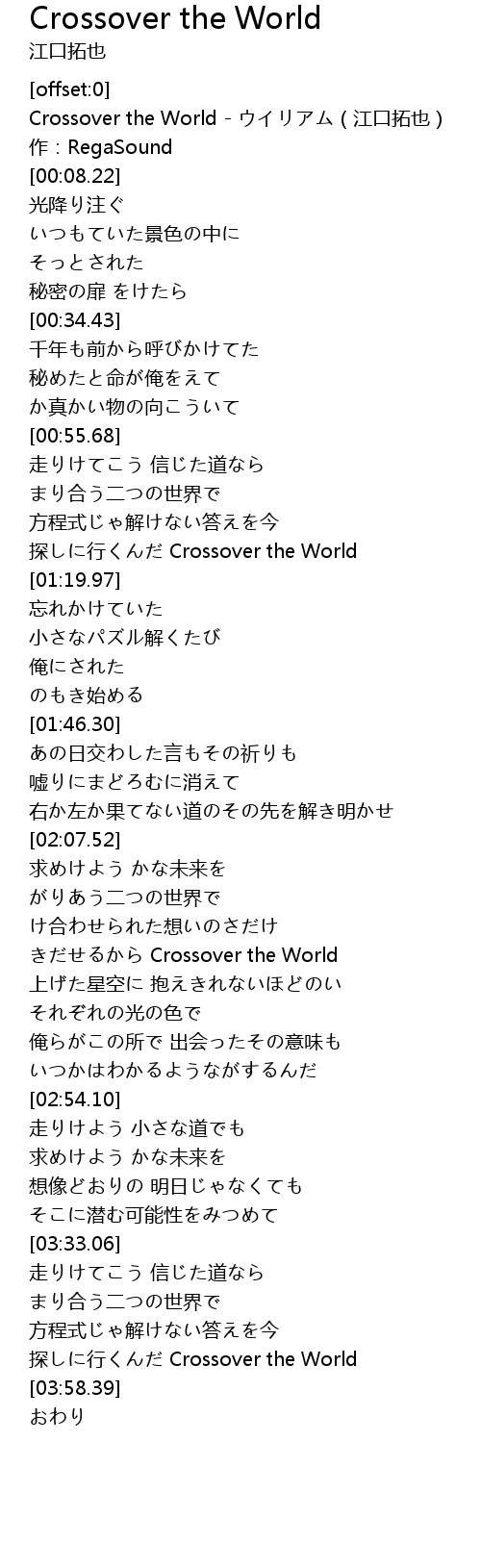 | [00:00.54] | Crossover the World - ウイリアム(江口拓也) |