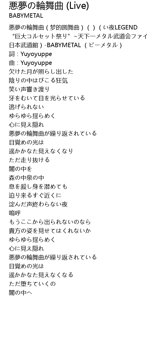 | [00:00.00] | 悪夢の輪舞曲(梦的圆舞曲)()(い夜LEGEND “巨大コルセット祭り”~天下一メタル武道会ファイナル~2014/3/1at 日本武道館)-BABYMETAL (ビーメタル) |