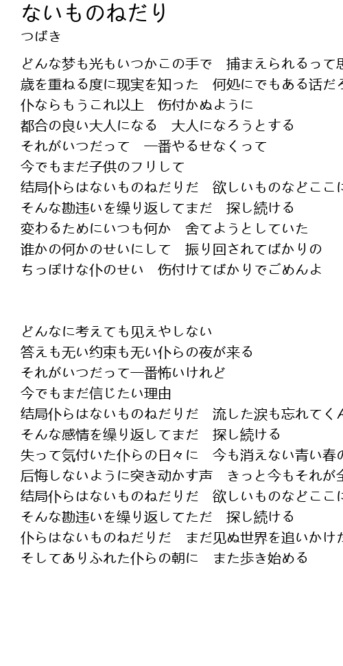 | 结局仆らはないものねだりだ 流した涙も忘れてくんだ | |