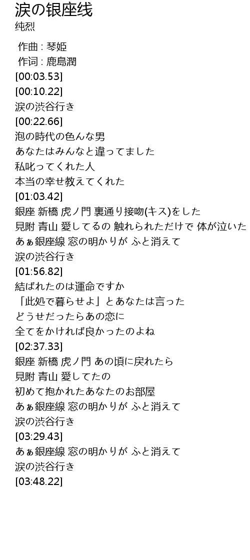 | [03:29.84] | あぁ銀座線 窓の明かりが ふと消えて |