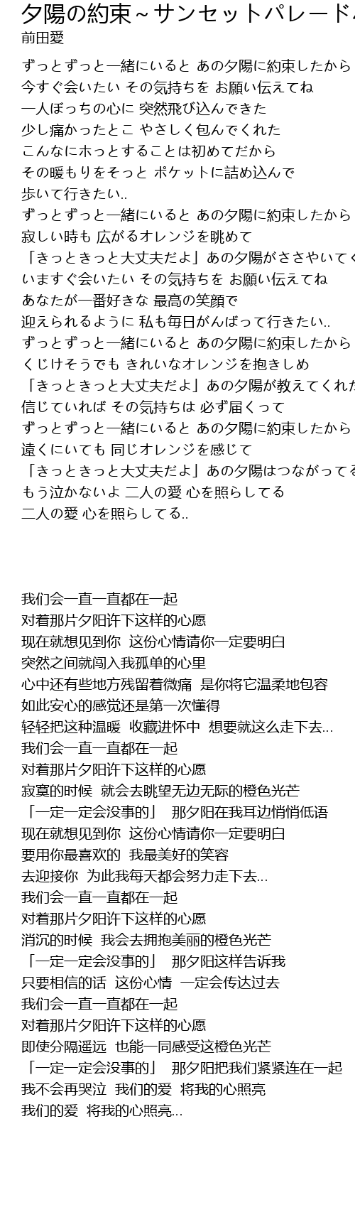 | [00:23.73] | ずっとずっと一緒にいると あの夕陽に約束したから |